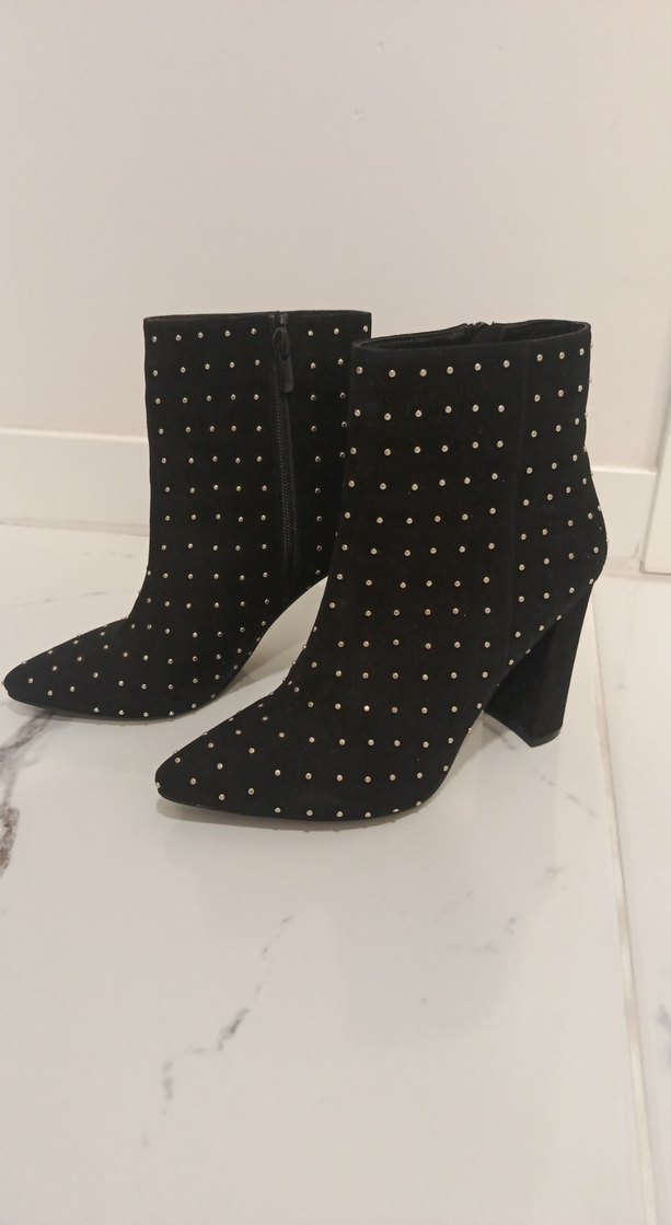 Siyah süet bilekte botlar, blok topuklu ve küçük boncuklarla oluşturulmuş puantiyeli desenlidir, 10cm topuk , hic giyilmedi temiz.