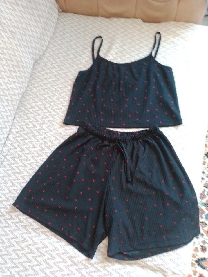 İnce ip askılı, kısa ve bol kesim siyah pijama takımı, küçük kırmızı desenlerle rahat bir kullanım sunar.