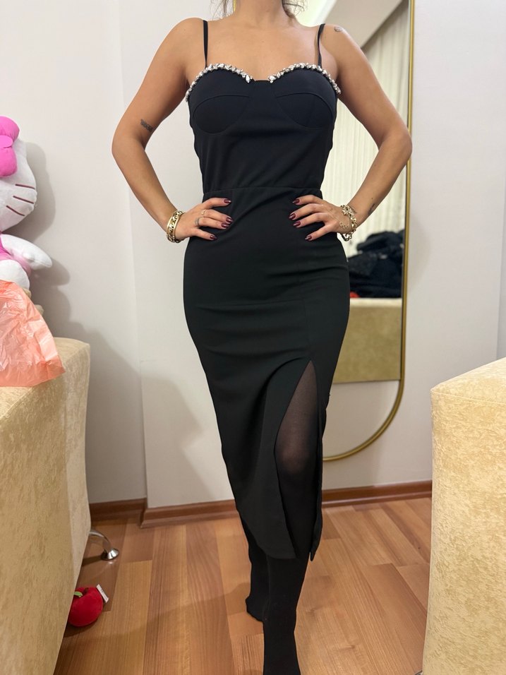 Siyah, ince askılı ve uzun, vücuda oturan elbise. Dekoratif detaylı, yırtmaçlı, gösterişli şık tarzı, hem özel günlerinize hem de ofise uygun.