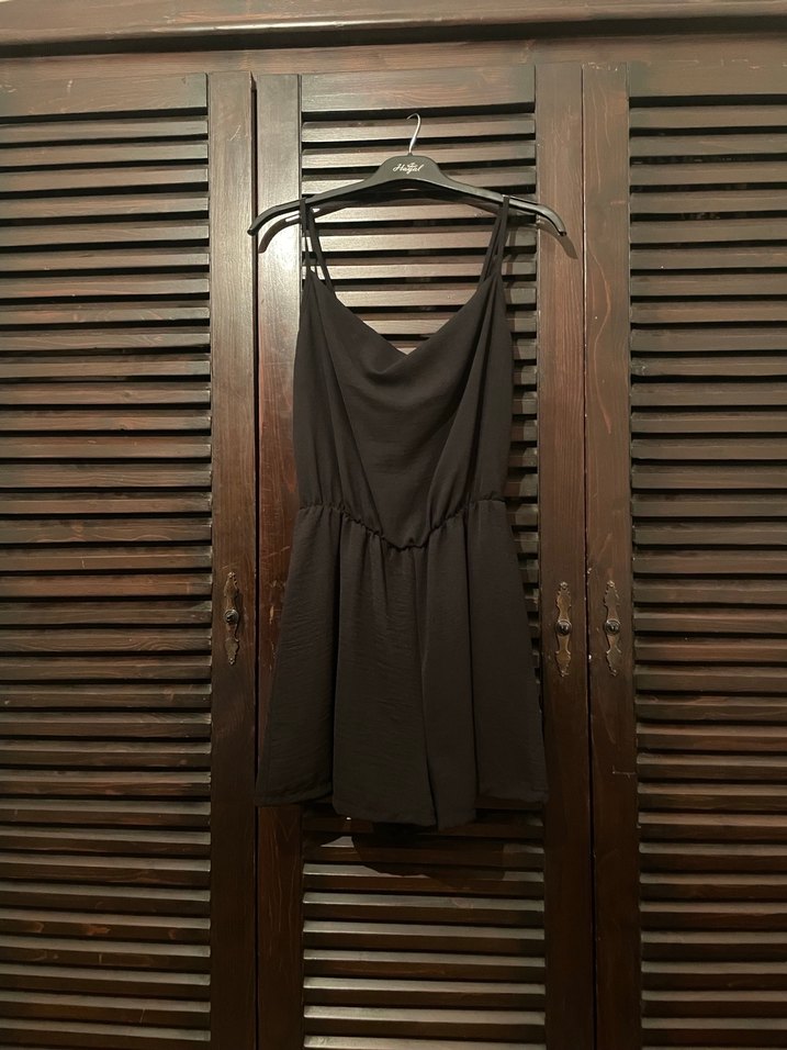 Siyah, ipek görünümlü kumaştan askılı, dökümlü yaka ve bol kesim mini tulum. Romantik akşamlar için uygundur.
