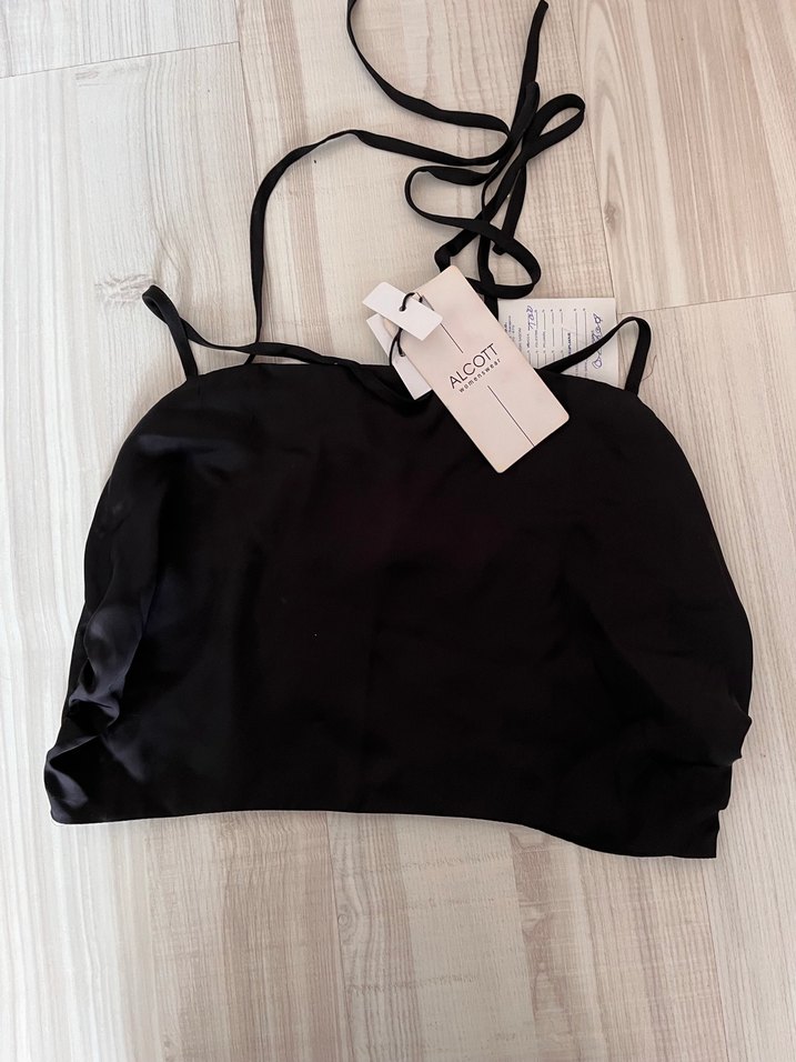Siyah, ipek görünümlü kumaştan, halter yaka ve ince askılı, bol kesim kısa uzunlukta, günlük kullanım için rahat ve şık bir bustiyer.