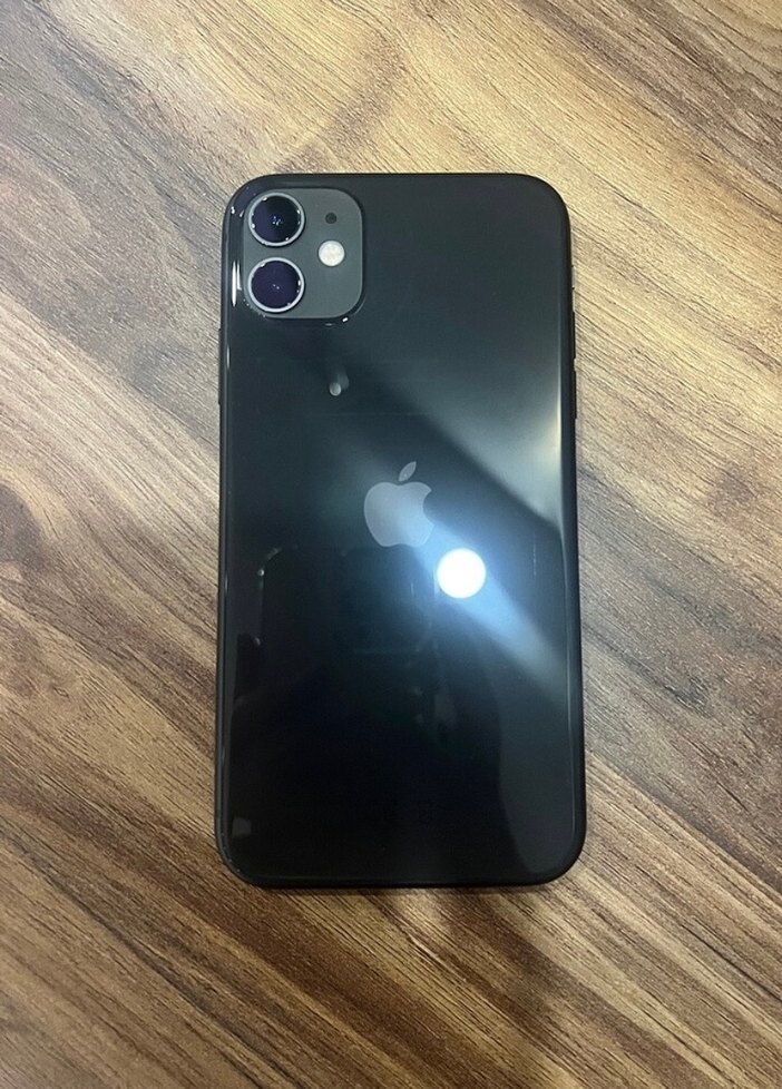 Siyah iPhone 11, çift arka kameraya ve şık koyu renge sahiptir. Orta kısımda Apple logosu bulunan pürüzsüz bir arka yüzeye sahiptir.
