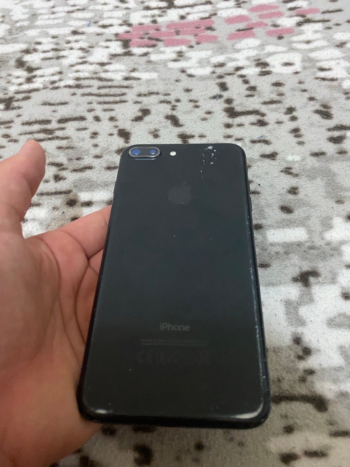 Çift arka kameraya sahip siyah iPhone 7 Plus. Mat yüzeyde hafif kullanım izleri bulunuyor. Ekran kurık ama kullanıma engeli yok