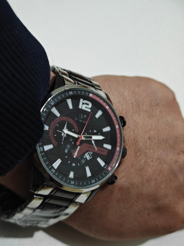 Bu siyah iş saatinde beyaz ve kırmızı detaylı kadran, tarih göstergesi ve metal kayış bulunur, çağdaş tarz ve işlevsellik sunar. ⌚