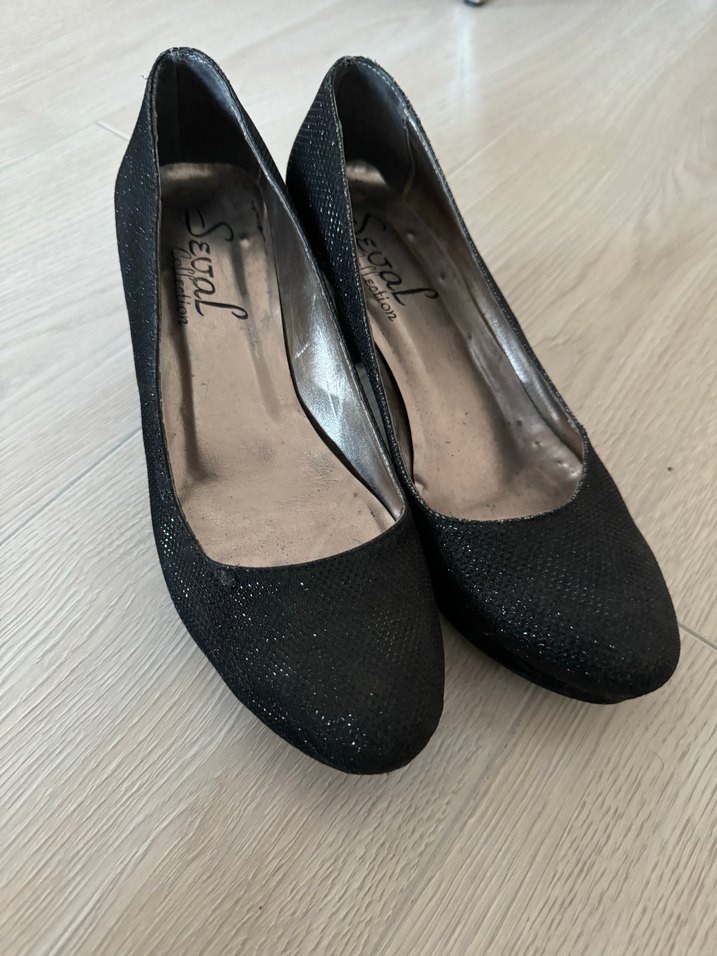 Siyah ışıltılı detaylı dolgu topuklu kadın ayakkabısı. trend goth tarzında. Çok az kullanılmıştır.Oldukça şık görünümlü.Topuk yüksekliği 7 cm dir.