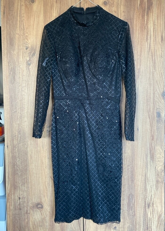 Ürün Oleg Cassini’den alınmıştır. Midi boydadır, pullu tül ile kaplıdır. Kendinden balenlidir, 36 bedendir. Bir kez kullanılmıştır.