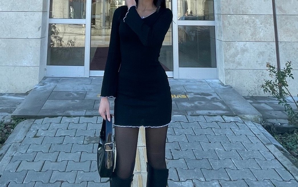 Siyah , işleme yaka ve uzun kollu mini elbise