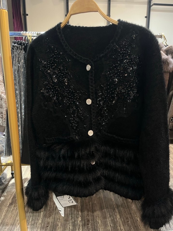Siyah İşlemeli Angora Kürk Detaylı Kadın Hırka