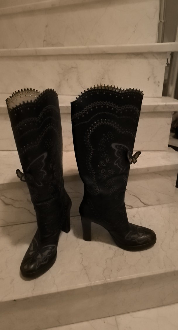 Siyah deri, işlemeli ve bağcıklı detaylı dizüstü botlar. Kama topuklu, günlük kullanıma uygun gotik ve bohem tarzda. hakiki deri numarası yazmıyor 36 numara uyumlu iade yoktur bilginize
