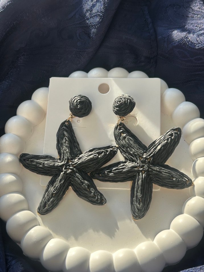 İşlemeli yıldız şeklinde, siyah boncuklu küpeler. Bohem ve avangart tarzda, parti için uygun. ✨