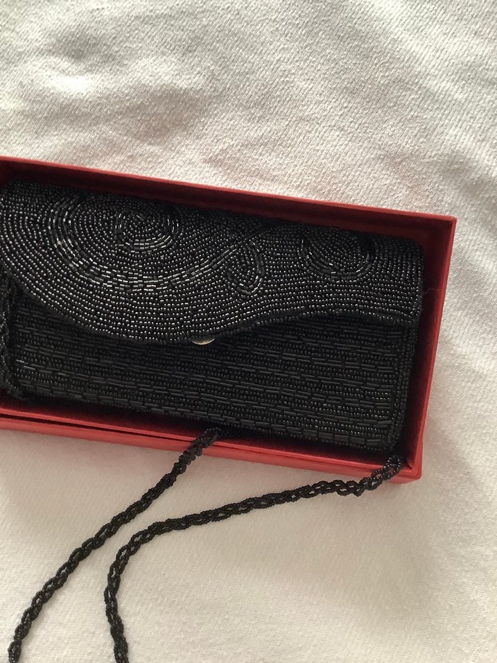 Siyah, ipek gibi dokulu kumaş üzerine işlenmiş ve boncuklarla süslenmiş klasik vintage tarzda kadın portföy çanta. İnce zincir askılı, düğünlere uygun.temiz defosuz, fermuarlı iç gözü var 22x11cm