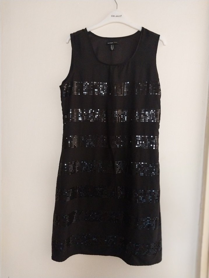 Kolsuz, siyah midi elbise, işlemeli ve boncuk detaylıdır. Dar kesim ve yuvarlak yaka tasarımıyla gotik tarzlara uygundur.