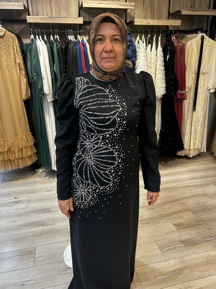 Siyah uzun elbise, yüksek yakalı ve uzun kollu olup, işlemeli çiçek desenleri ve boncuk detaylarıyla mütevazı ve göz alıcı bir sokak tarzı sunar.✨
