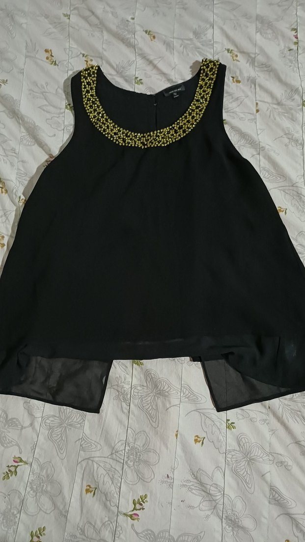 Siyah, kolsuz, straplez yaka bluz. Salaş kesim, drapeli tasarım ve işlemeli desen içerir. Gotik ve avangart tarzlara uygundur. Parti için ideal.