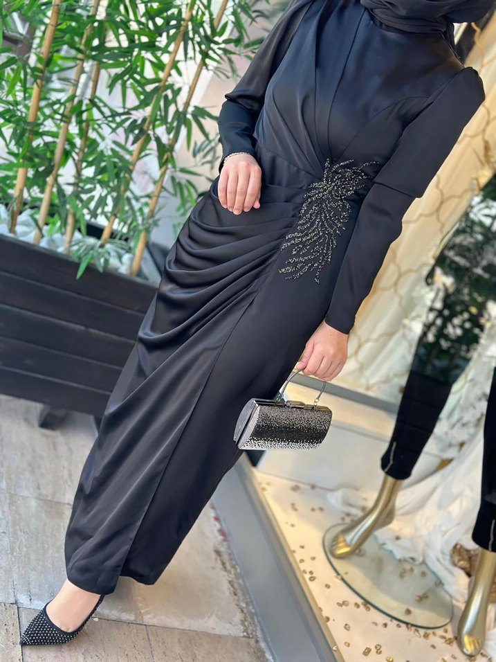 Bu siyah, işlemeli ve drapeli uzun abiye elbise, dar kesimi ve uzun kollarıyla düğünler için uygundur. Straplez yaka detayına sahiptir. ✨
