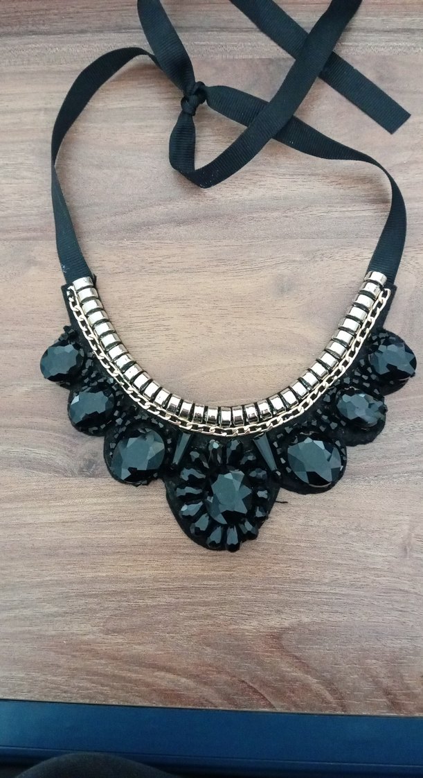 Siyah işlemeli ve büyük boncuk detaylı gotik stile uygun, midi uzunlukta ve kurdele bağlamalı kolye. Bohem ve retro tarzlar için uygundur.