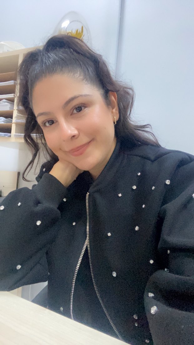 Siyah, parlak işlemeli, yakalı ve uzun puff kol detaylı, bol ve normal boyda kadın bomber ceketi. Rahat ve sıcak kumaş kullanılmış.