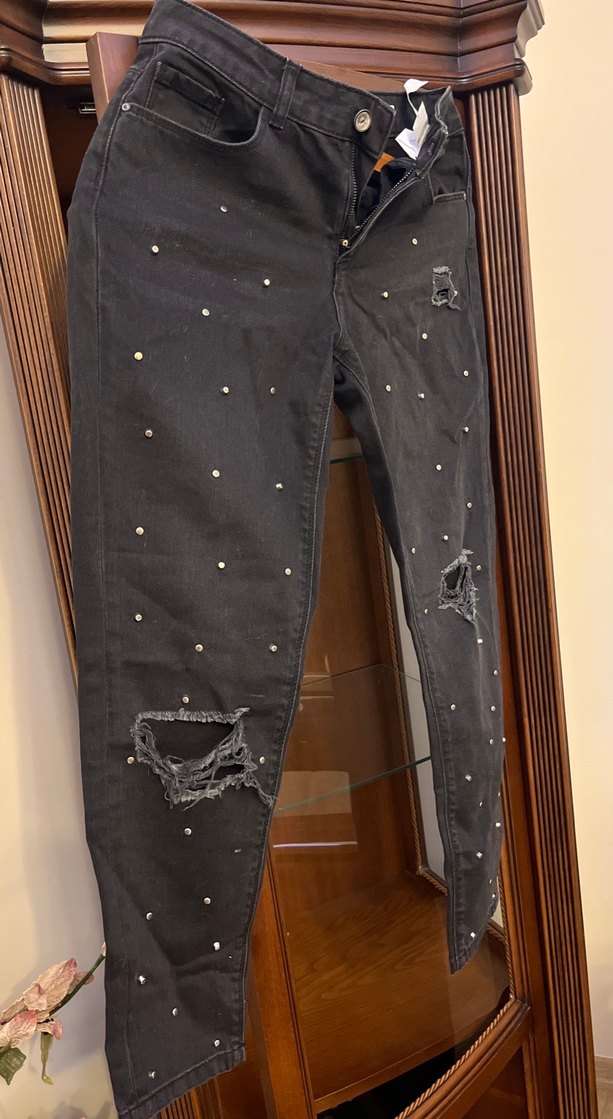 Siyah kot pantolon, normal midi boy, işlemeli ve tokalı detaylara sahip, günlük kullanıma uygun streetwear tarzında. Özgür tarzı olanların pantolonu tam kalıptır ürün boyu 90 beli düğme kapalıyken 35 cm’dir
