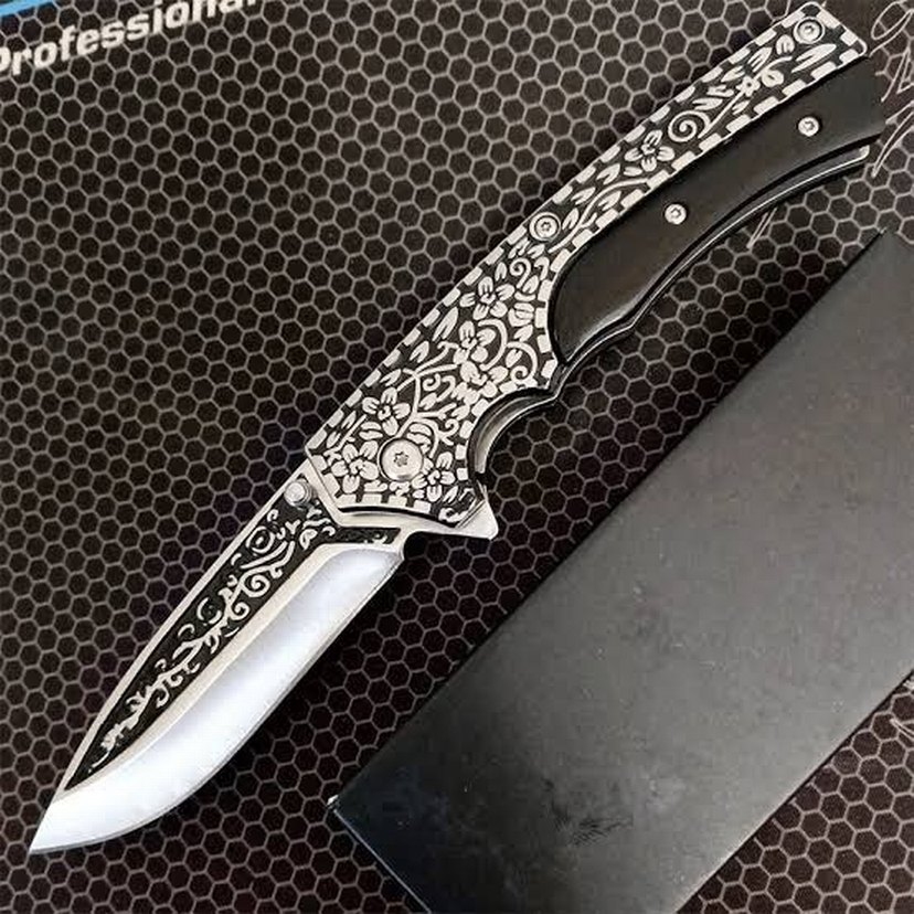 Sap ve bıçakta detaylı çiçek işlemeleri bulunan siyah katlanır bıçak, keskin paslanmaz çelik ağızlığa sahiptir.