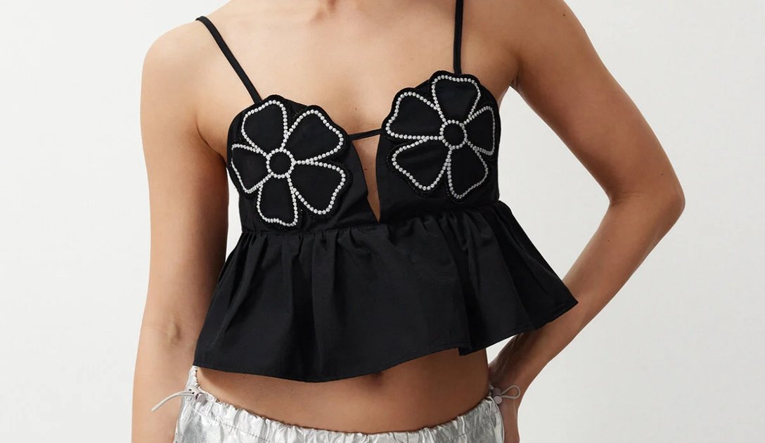 Siyah, işlemeli çiçek detaylı, askılı ve kısa volanlı, vücuda oturan bustier. Partiler için iddialı ve şık bir tercih.