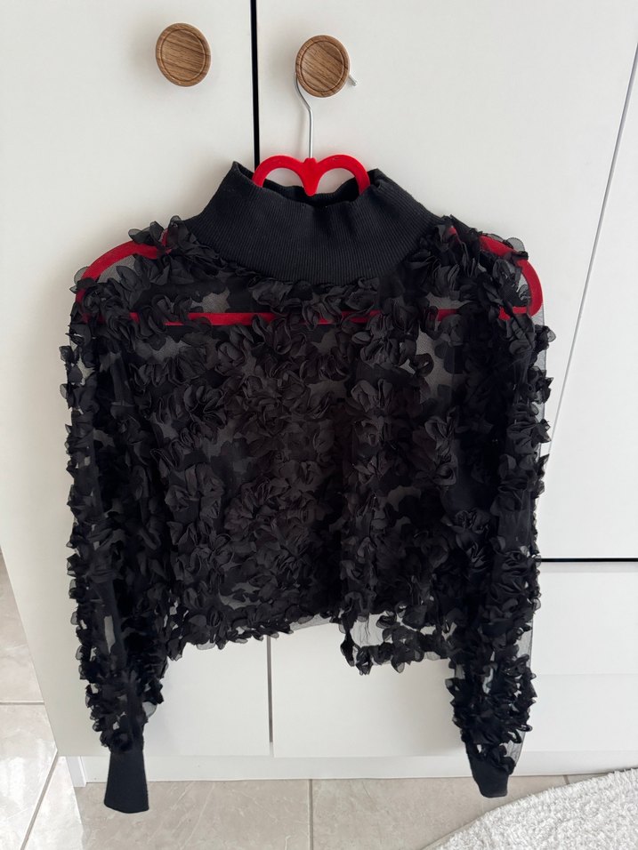Dar kesim siyah bluz, uzun kollu, yüksek yakalı ve işlemeli fırfır detaylıdır, gotik parti tarzı için uygundur. ✨
