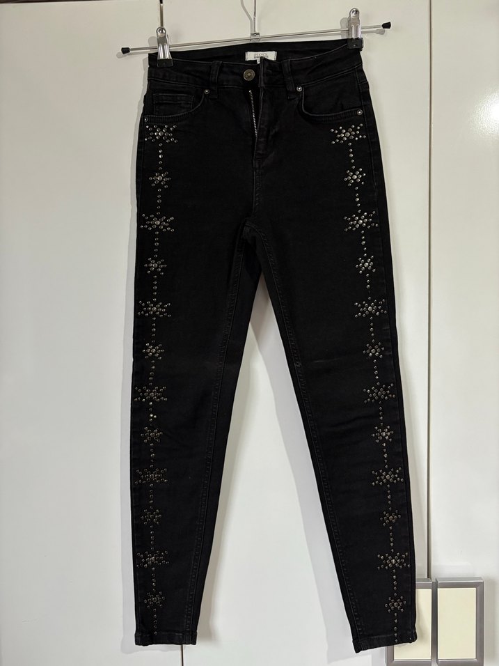 Siyah denimden yapılmış, yanlar boyunca işlemeli ve payetli detaylara sahip dar kesim kadın kot pantolon. Romantik buluşmalar için uygun şık bir sokak stili sunar. ✨2 kere filan giyilmiştir.İşlemeler zımba ve sağlamdor.