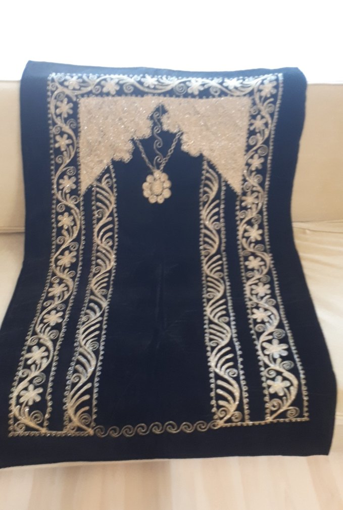 Siyah kadife üzerine işlemeli seccade. 80 * 130 cm ölçülerinde