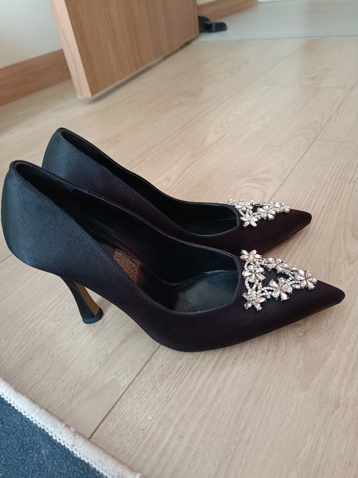 Siyah İşlemeli Taşlı İnce Topuklu Kadın Ayakkabı