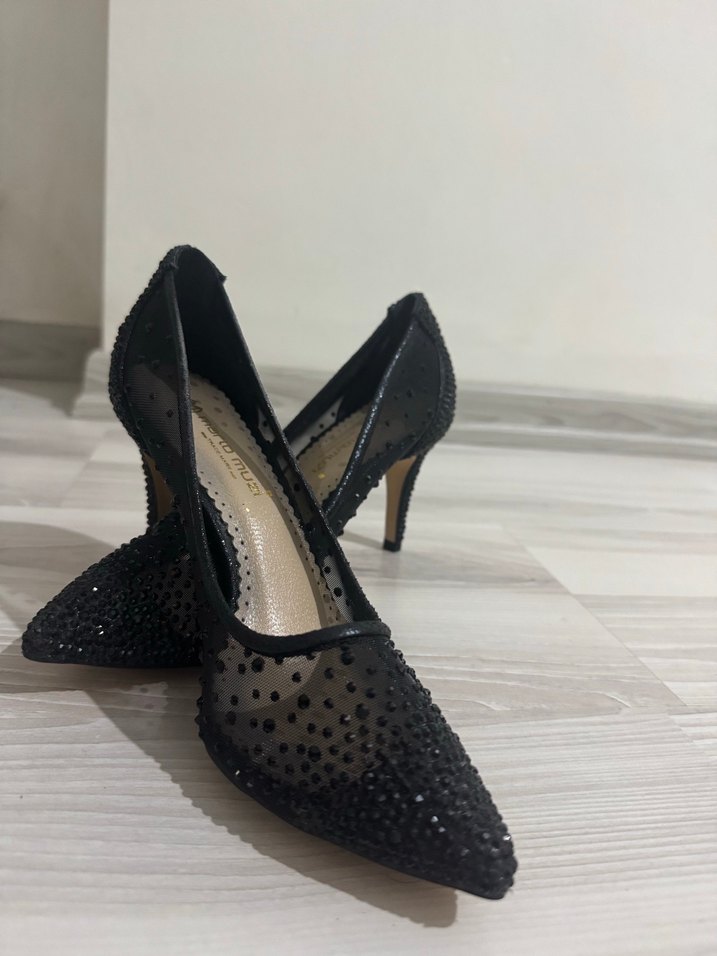 Siyah işlemeli ve payetli, ince topuklu, kauçuk tabanlı kadın ayakkabısı. Düğün gibi özel günler için uygun, gösterişli gotik stile sahip. 1 defa kullanıldı fazlalıktan satılıktır