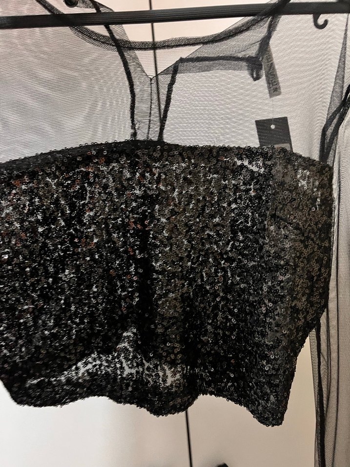 Siyah renkli, abiye bluz transparan yaka ve kollu pul işlemeli detaylara sahiptir