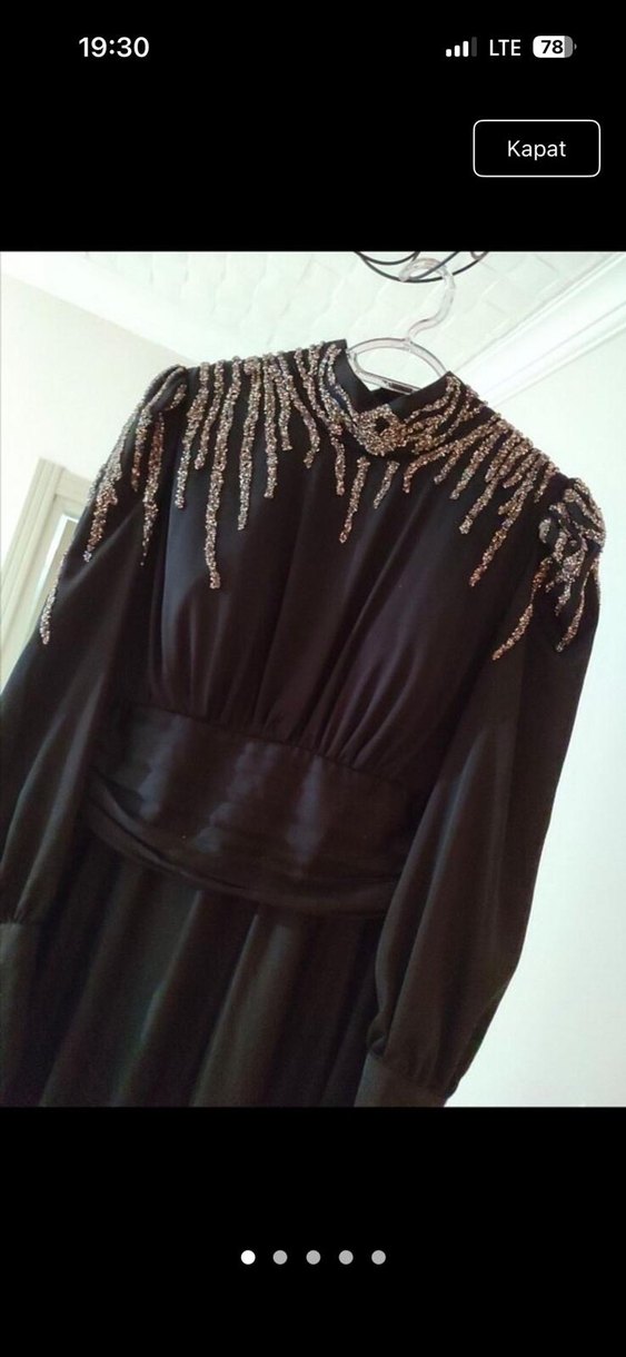 Yüksek yakalı, işlemeli detaylara sahip parlak siyah uzun abiye elbise, klasik ve şık bir görünüme sahiptir.