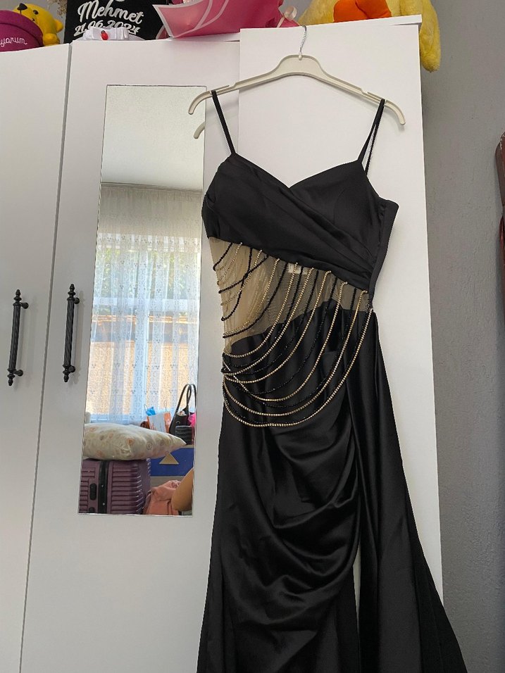 Siyah, işlemeli ve parlak detaylara sahip, askılı ve drapeli uzun abiye elbise, fit kesimiyle avant-garde parti tarzına uygundur. ✨ sadece bir kere giyildi 38 ve 40 bedene uygundur