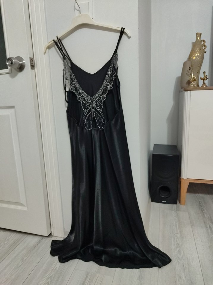 V yaka, ince askılı, işlemeli ve drapeli siyah uzun a klasik gotik şıklık sunar. vücuda oturan kesim.s m bedendir