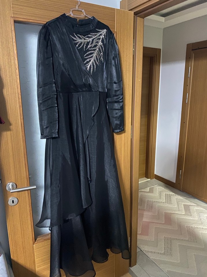 Siyah renkli, uzun kollu ve yüksek yakalı bu abiye elbise, işlemeli detaylar ve drapeli tasarımıyla dikkat çeker. Gevşek kesimi ve uzun boyu ile gotik tarzda düğünler için uygundur.