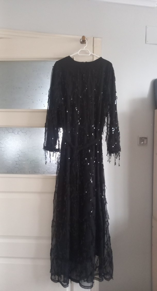 Siyah, işlemeli, uzun kollu, drapeli ve bol kesim uzun gece elbisesi. Yuvarlak yaka ve gotik tarzda parti için uygundur.