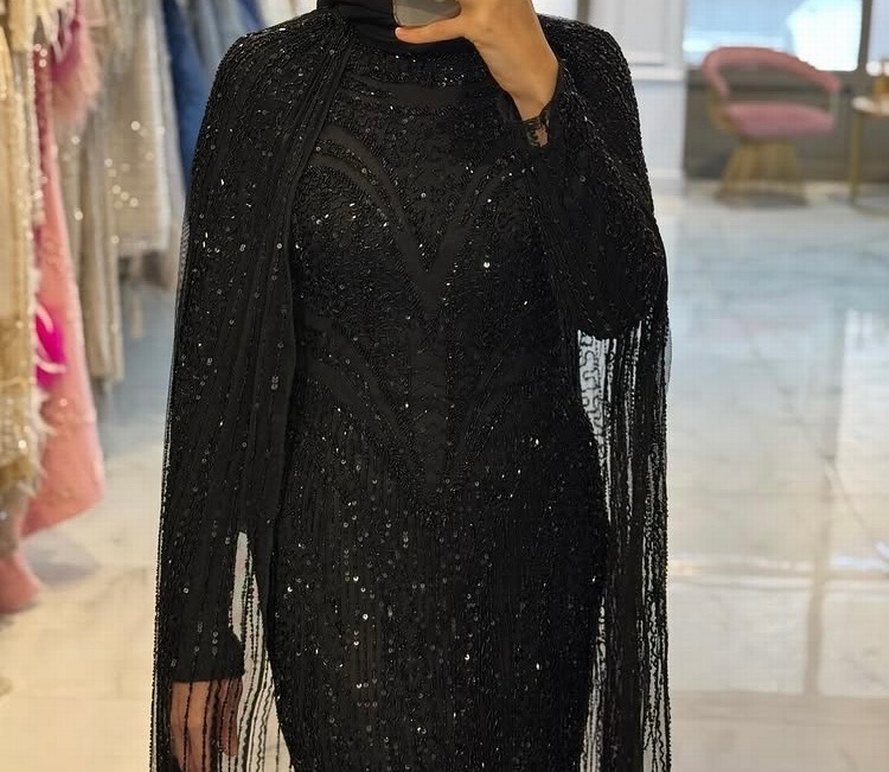 Siyah İşlemeli Uzun Kollu Kadın Abiye Elbise