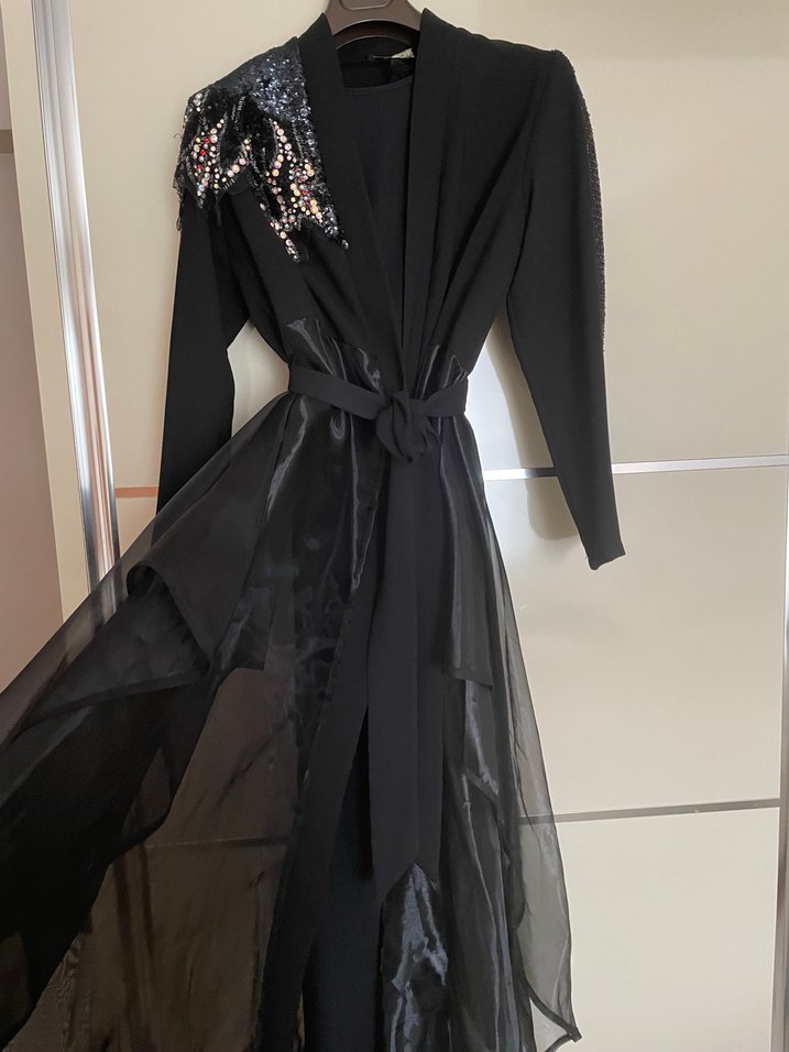 Siyah, işlemeli detaylı, uzun kollu ve yakalı, drapeli, beli kuşaklı, dar kesim kadın abiye elbise. Avant-garde tarz için uygun. 38 beden alt şifon, tercihe göre içlik bir elbise yada siyah pantolon ile harika duruyor.