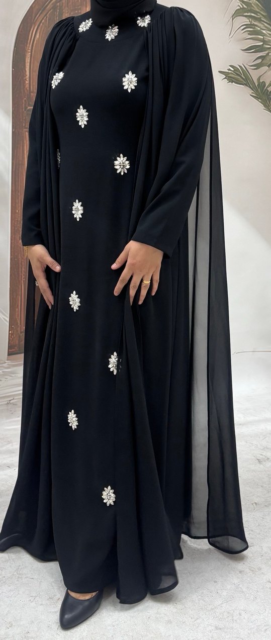 Siyah uzun kollu, yüksek yakalı kadın elbise, işlemeli detaylara sahip. İpek gibi kumaşla drapeli ve bol kesim, düğünler için uygun. ✨ Özel dikimdir. kendinden pelerinlidir. 40-42 beden uyumludur. 1 kere giyildi.