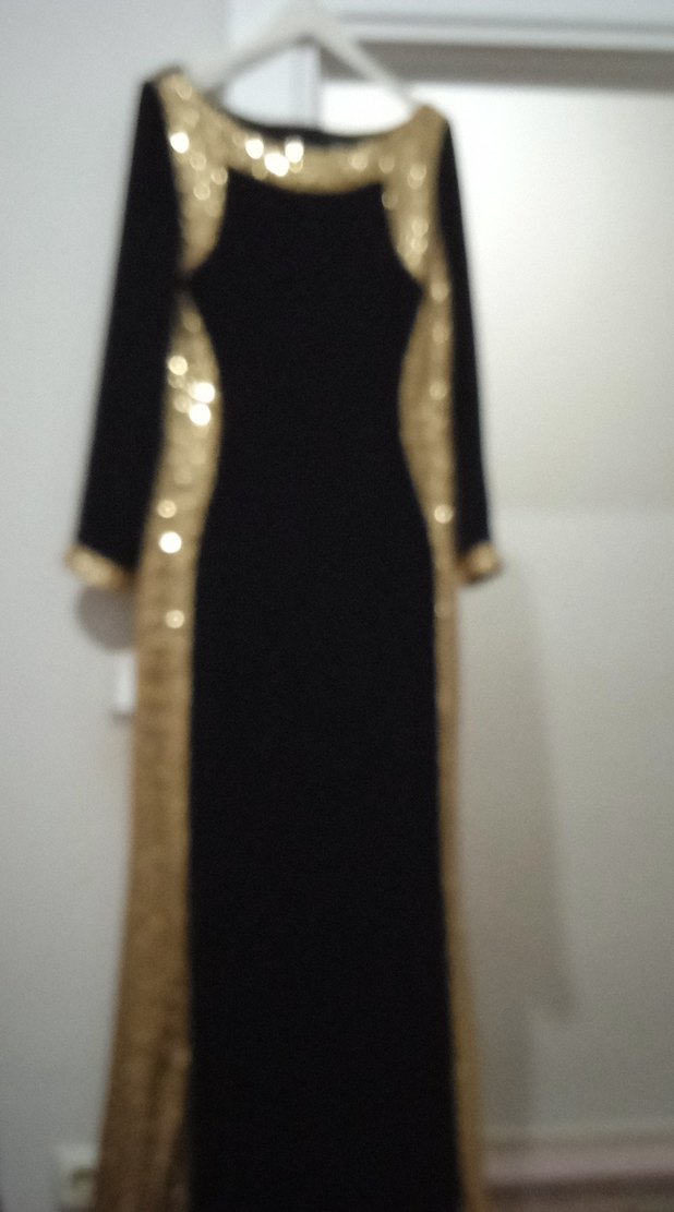 İNDİRİMDEDİR! Satenimsi kumaştan, işlemeli detaylara sahip, uzun kollu ve tekne yaka siyah uzun elbise. Drapeli ve klasik şıklıkla goth tarzını yansıtır. sağ sol kısımları altın rengi pul işlemeli birkaç sefer giyinmiş kol ağızlarında detayları var altın rengi pullar memnun kalacağınızdan eminim ✨