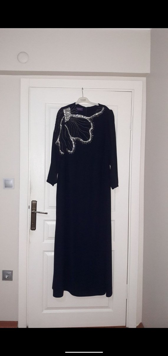 Siyah İşlemeli Uzun Kollu Uzun Elbise