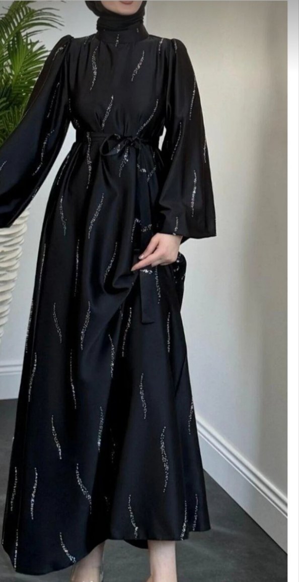 Siyah, işlemeli ve parlak detaylara sahip uzun, salaş kesim elbise. Yüksek yakalı, uzun ve askılı kolludur, bele bağlama ipi vardır.