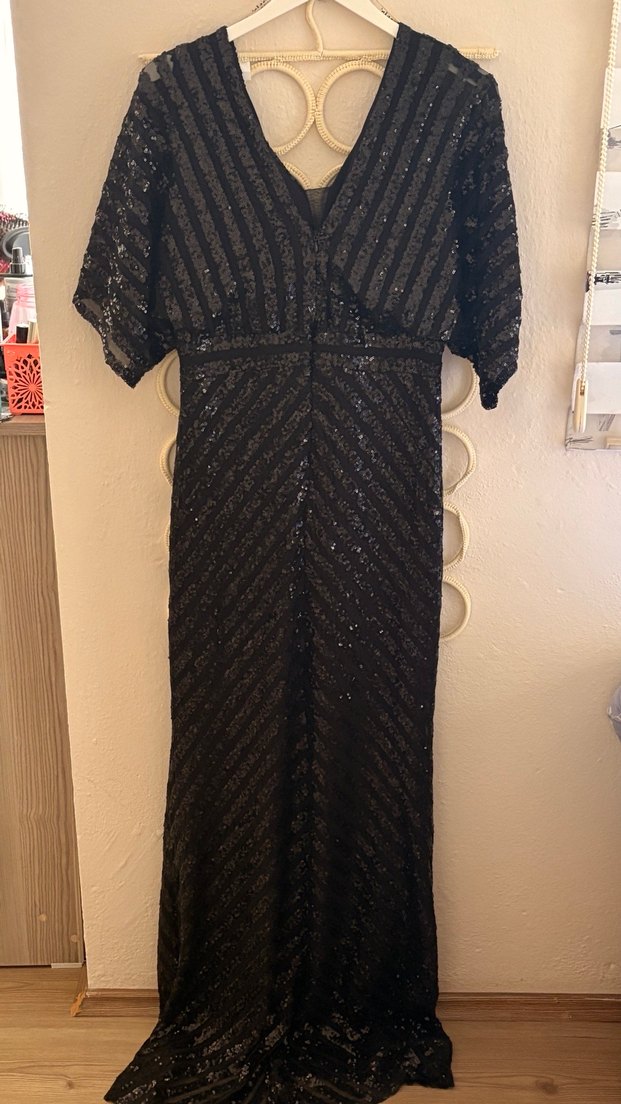 Siyah, işlemeli ve boncuk detaylı, , V yaka kısa kollu, klasik şıklıkta uzun abiye elbisedir. Düğün davet akşamları için uygundur. 46 bedendir toparlayıcı etkisi vardır