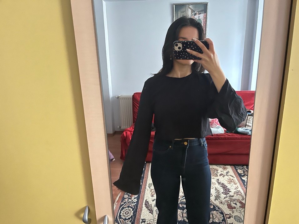 Siyah uzun İspanyol kollu, bisiklet yaka bluz. Hiçbir kusuru yoktur. M beden.