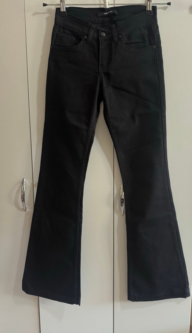 Siyah İspanyol paça pantolon, sorunsuz. Marka temsili