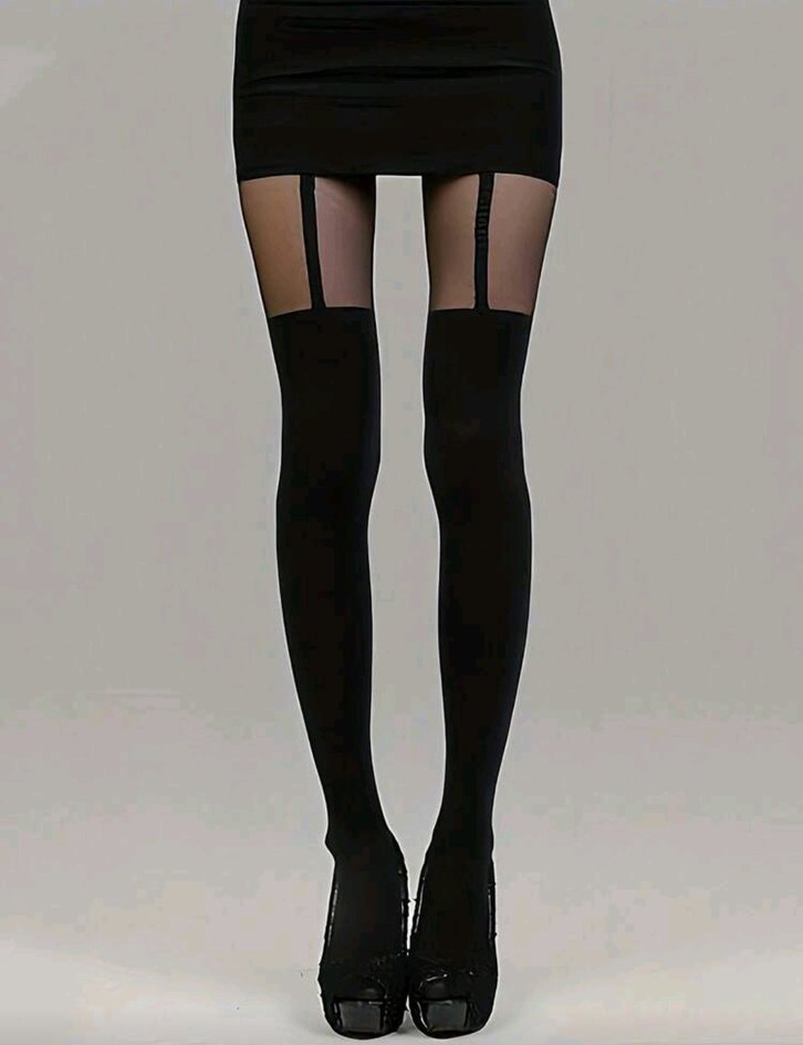 Siyah, koyu renkli, diz üstünde transparan detaylı külotlu çorap.
