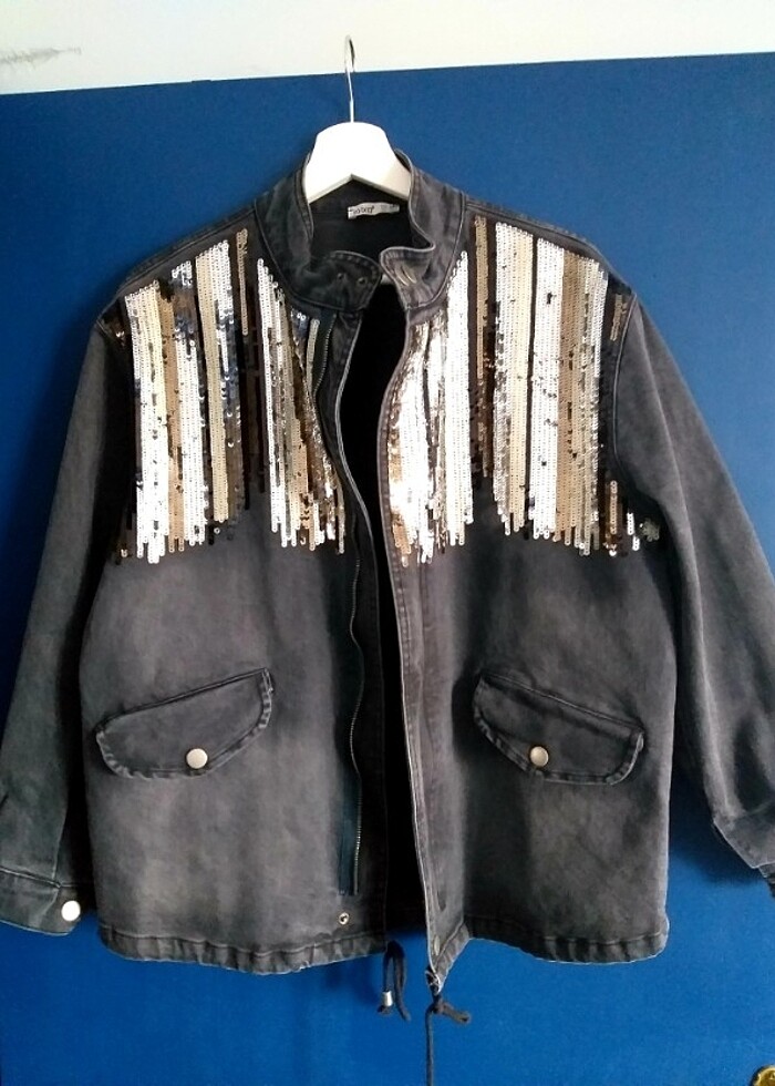 Siyah jean ceket pul payet geçişleri olan çok şık bir ceket..Alt ve bel kısmında bağcıkları vardır..Şıkır şıkır parlayan kalın jean tok bir ceket..En fazla bir kere giyilmiş olsun,tertemiz..42 beden ama ben 38-40 aralığındayım ve rahat giyiyorum..