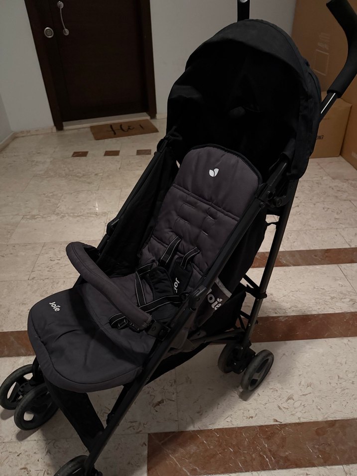 Siyah Joie bebek arabası, konfor için yastıklı oturma alanı ve ayarlanabilir tente içerir. Güvenli kemer ve kolay sürüş için pürüzsüz tekerlekler bulunur.