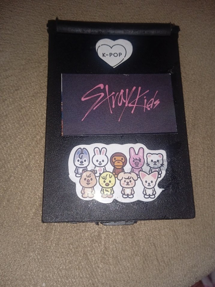 K-Pop temalı kalp, Stray Kids logosu ve sevimli çizgi karakterler içeren siyah cep aynası