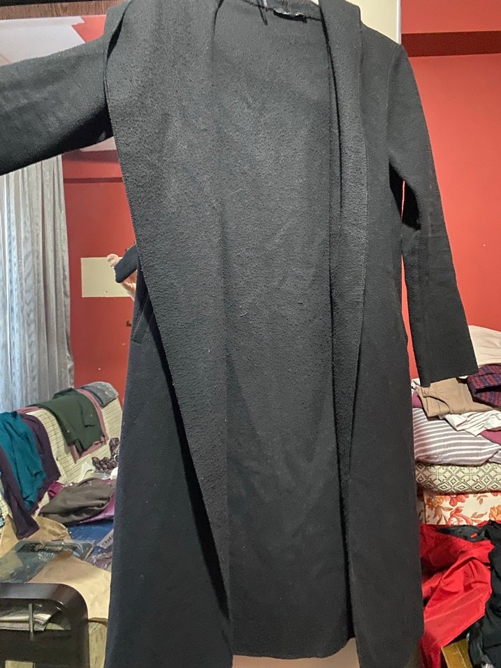 Siyah uzun ince kaşe kumaştır omuzdan boy 105 cm iki koltuk arası 48 cm s-36 bedene uygun kilo aldığım için çok uzun zamandır giymedim düğmesi yok