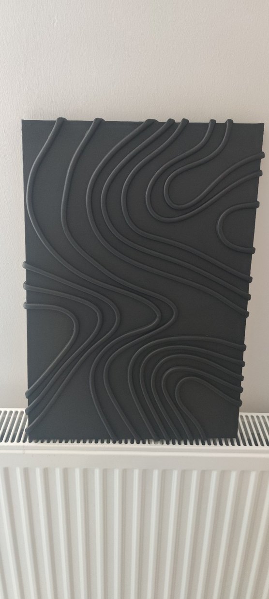 Kabartmalı, akışkan çizgilerle soyut bir tasarım sunan siyah modern tablo. Her mekana sanatsal bir dokunuş katıyor. 35×50 tuval üzerine izolasyon bandı ile doku verilip akrilik boya ile boyandı. istenilen renk model ve boyutta yapılır